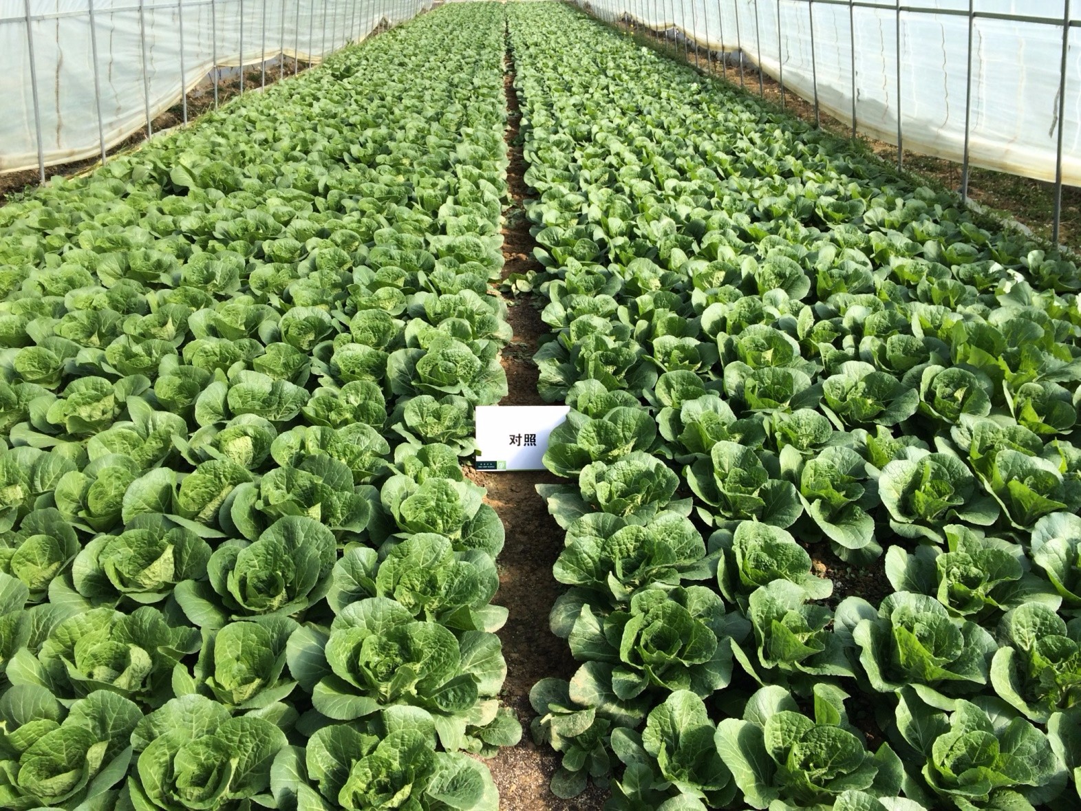 从处理与对照中选取大小接近的两颗黄白进行叶片的剥离拆分,优美柯处理下黄白的包心紧实度,叶片数量及叶片厚度均好于对照。从土壤覆盖面积看,优美柯处理的黄白,单株生长量及均一度明显好于对照。